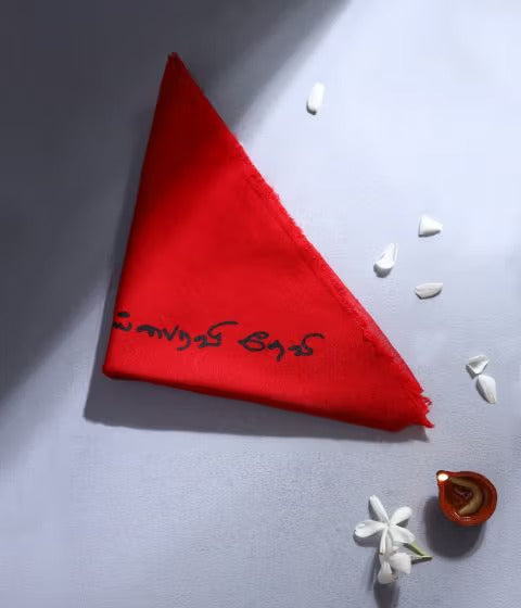 這款神聖的棉質 Devi Vastram 染成了火紅色(Devi 的顏色),上面有書法絲網印刷,用泰米爾語寫著“Jai Bhairavi Devi”。你可以將它放在你的 puja 房間或 Gudi、生活或工作空間附近,以傳播正能量。你也可以將它作為頭巾佩戴,或將其綁在你的車上以接受 Devi 的恩典。